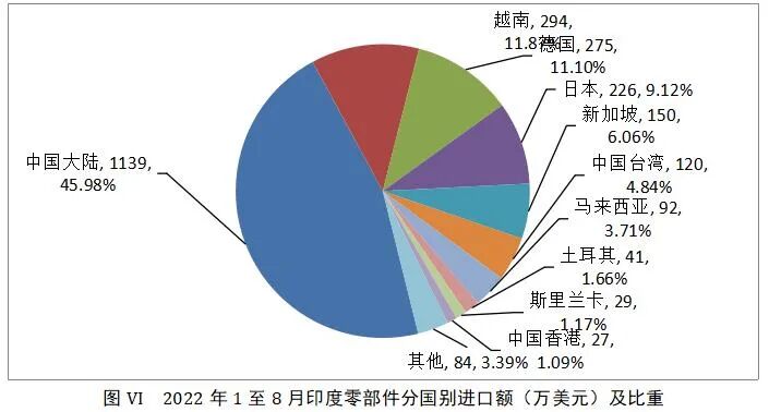 2022年1至8月,印度零部件分国别累计进口额排名第一的仍然是中国大陆,约为1139万美元,占比45.98%,去年同期印度自中国大陆进口零部件约861万美元,占比约42.04%,进口额同比增长32.29%,进口比重增长约4个百分点;第二位是越南,约为294万美元,占比约11.87%;第三位是德国,约为275万美元,占比约11.10%;第四位是日本,约为226万美元,占比9.12%;第五位新加坡,约为150万美元,占比约6.06%(详见图6)。