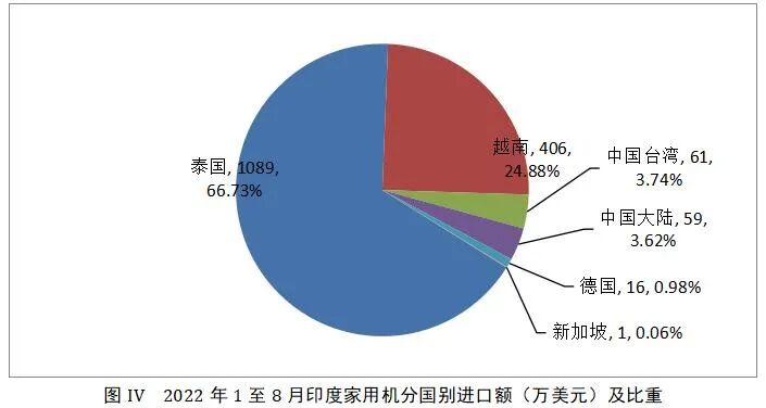2022年1至8月,印度家用缝纫机分国别累计进口额排名第一的是泰国,约为1089万美元,占比约66.73%;其次是越南,约为406万美元,占比约24.88%;中国台湾排名第三,约为61万美元,占比3.74%;第四位中国大陆,约为59万美元,占比约3.62%,去年同期印度自中国大陆进口家用机约128万美元,占比约8.43%,进口额同比下降53.91%,进口比重下降约5个百分点。第五位德国,约为16万美元,占比约0.98%(详见图4)。