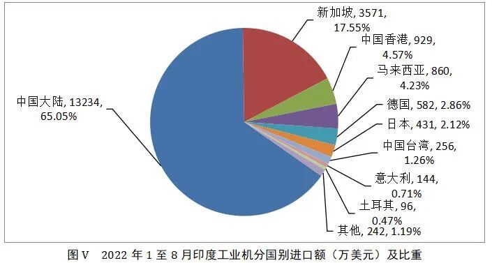 2022年1至8月,印度工业机分国别累计进口额排名第一的是中国大陆,约为1.32亿美元,占比约65.05%,去年同期印度自中国大陆进口工业机约8847万美元,占比约60.71%,进口额同比增长49.59%,进口比重增长4个百分点;其次是新加坡,约为3571万美元,占比约17.55%;排名第三位是中国香港,约为929万美元,占比约4.57%;第四位马来西亚,约为860万美元,占比约4.23%;第五位德国,约为582万美元,占比约2.86%(详见图5)。