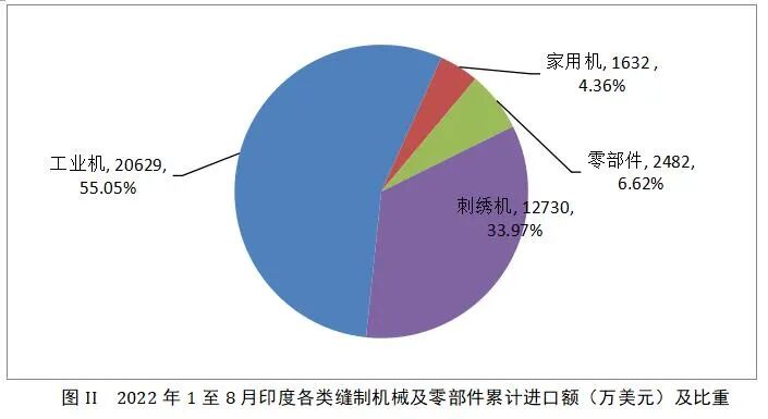 2022年1至8月,印度累计进口各类缝制机械及零部件约3.75亿美元,同比增长59.46%。其中,进口量最大的是工业缝纫机,前8月累计进口额约为2.06亿美元,占比约55.05%;其次为刺绣机,约为1.27亿美元,占比约33.97%;零部件进口额约为2482万美元,占比约6.62%;家用机进口额约为1632万美元,占比约4.36%(详见图2)。