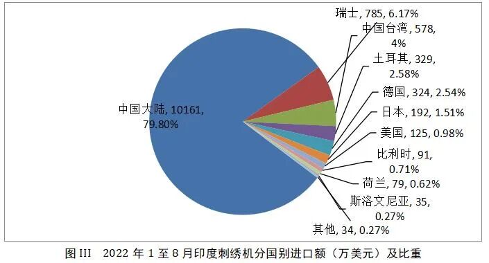 2022年1至8月,印度刺绣机分国别累计进口额排名第一的是中国大陆,约为1.02亿美元,占比约79.80%,去年同期约为4437万美元,占比约82.81%,进口额同比增长129.01%,进口比重下降约3个百分点。紧随其后的是瑞士,约为785万美元,占比约6.17%;第三位中国台湾,约为578万美元,占比约4%;第四位土耳其,约为329万美元,占比约2.58%;第五位德国,约为324万美元,占比约2.54%(详见图3)。