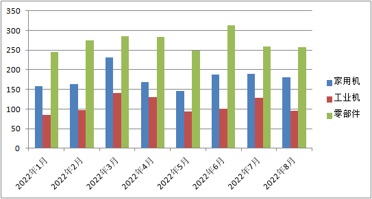 印度缝制机械行业年出口规模约在5千万到8千万美元之间。2022年8月,印度家用缝纫机出口额约为181万美元,环比下降约4.74%,同比下降约3.20%;工业机出口额约为96万美元,环比下降约25.58%,同比下降约25.00%;零部件出口额约为257万美元,环比下降0.77%,同比下降约11.07%(详见图7)。